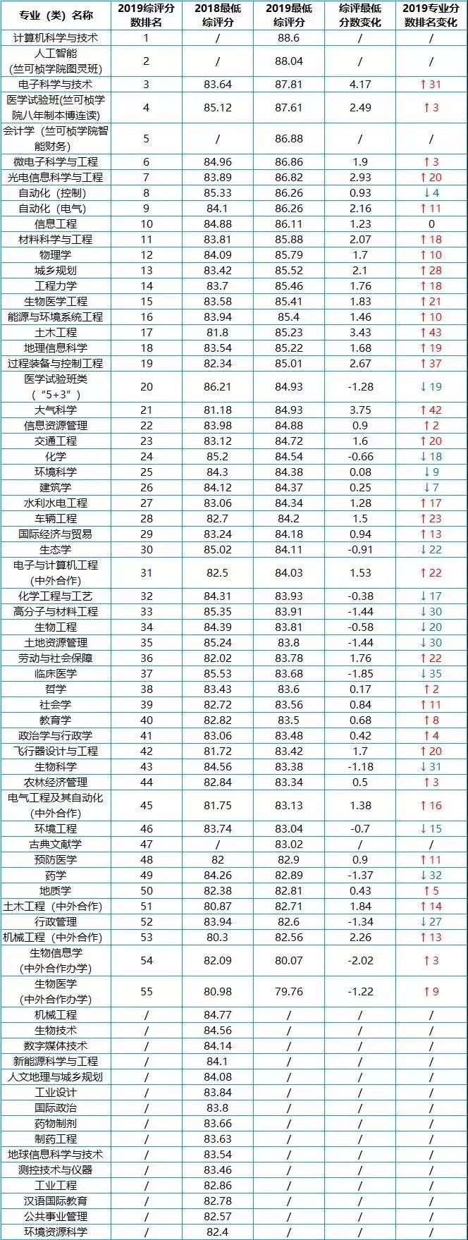 整体综评分数变化不大,上升的平均值为0.87分。单个专业中,电子科学与技术、土木工程、大气科学和光电信息科学与工程4个专业综评分数涨分幅度较大。较2018年,2019年的综评最低分分别上涨了+4.17分、+3.43分、+3.75分、+2.93分。而生物信息学(中外合作办学)、临床医学、高分子与材料工程和土地资源管理的降分幅度较明显、综评最低分分别下降了-2.02、-1.85、-1.44、-1.44分。