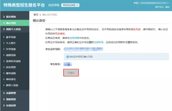 (1)若之前在“阳光高考特殊类型招生报名平台”参加过其他项目的报名,则系统中会保存有之前填报的个人信息,请仔细核对,确认无误后进行下一步骤。