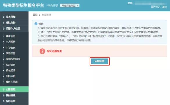 (1)仔细阅读相关说明,点击“添加志愿”。