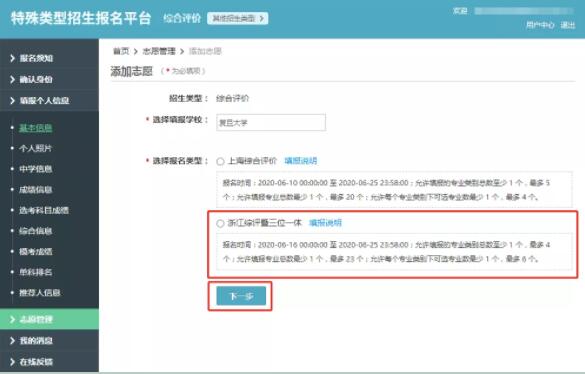 (3)选择报名类型:浙江综评暨三位一体。仔细阅读填报说明。