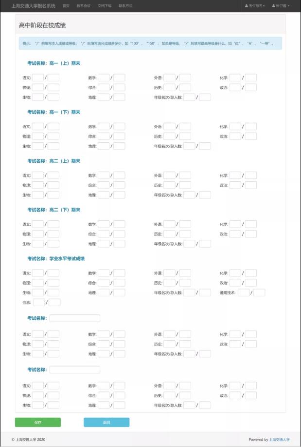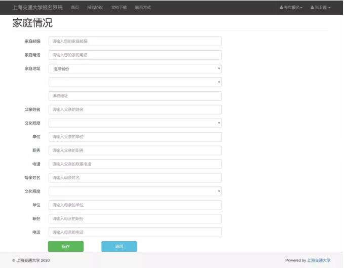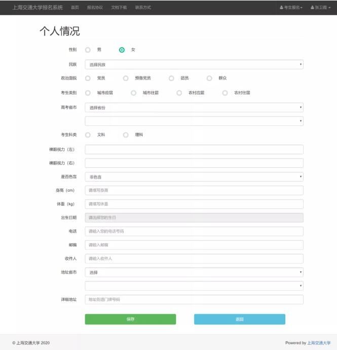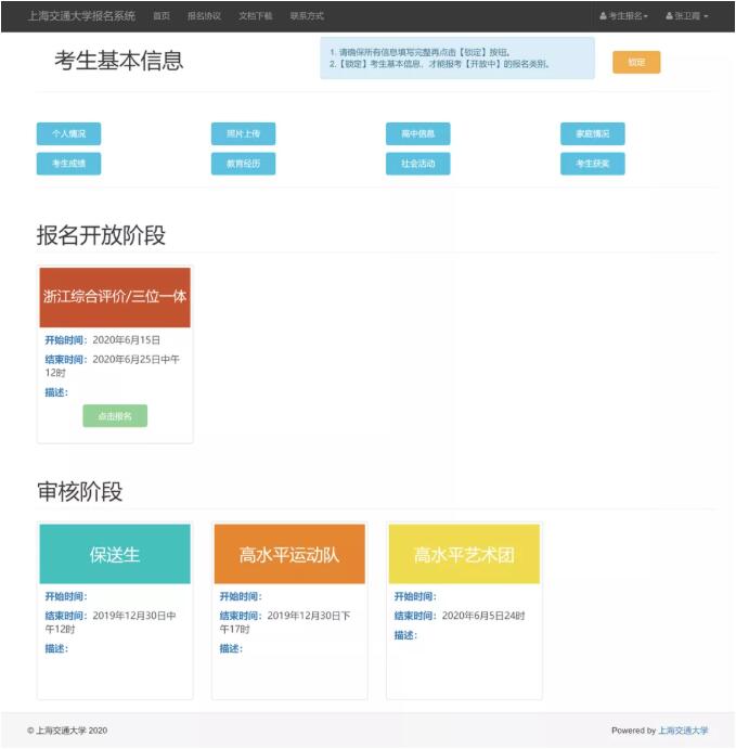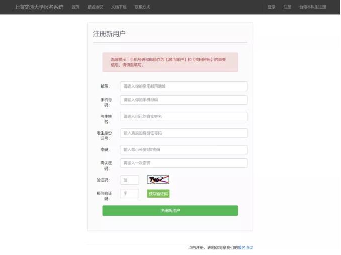 1、注册信息。考生登录上海交通大学报名系统,使用考生本人身份证号码注册信息,手机号可以使用家长的,完成注册之后建议考生抄录账号和密码,以免忘记。