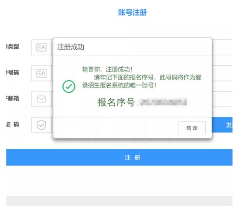 2、注册成功之后会系统会生成考生的报名序号,此号码将作为登录招生报名系统的唯一账号,各位考生注意截图保存,并将此账号抄录下来,多做备份。