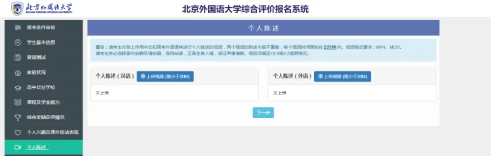 据悉,2021年北京外国语大学综合评价报名时需要提交个人陈述,而今年的形式也与往年有所不同,要求上传两段视频材料。