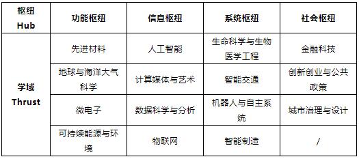 A:不同于传统的院系设置,港科广采用枢纽(hub)和学域(thrust)两级学术架构。各个领域交叉互通,学生们可以更好地建立多领域的专业知识系统,从而进行跨学科探索研究。目前已开设4个枢纽,下设15个学域,都已开放招生。