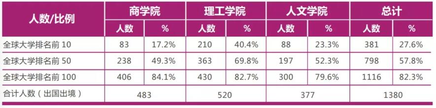 海外升学总人数高达1380人,其中有381人(27.6%)被前十的顶尖学府录取,798人(57.8%)赴世界前五十大学继续深造,1136人(82.3%)入读世界前一百的高校。