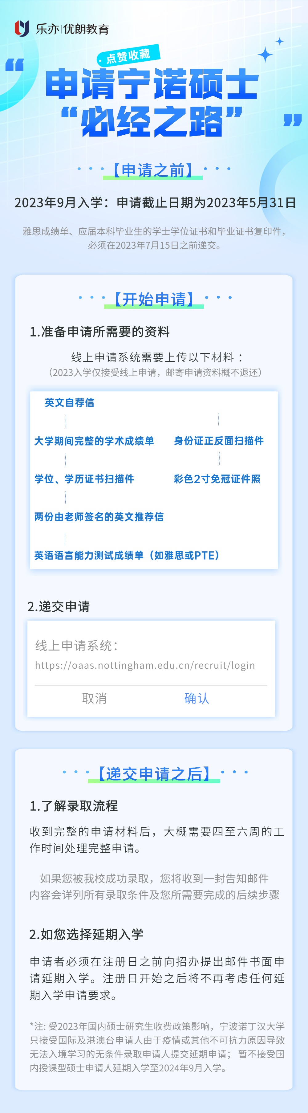 本文将解读宁波诺丁汉大学2023年授课型硕士的升学指南,申请授课型硕士学位项目,请先注意你意向专业的学习年限和入学要求,同时也请详细了解课程内容和相关的费用及奖学金政策之后,再做最后的申请决定。