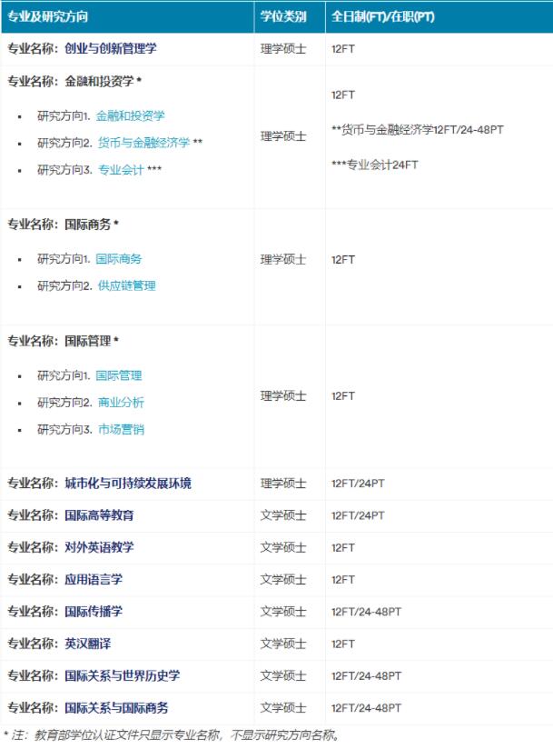 授课型硕士提供全日制学制一年/在职(二年至四年)硕士研究生项目。在职项目只针对部分课程开放(且在职项目仅针对中国大陆以及港澳台学生开放)。