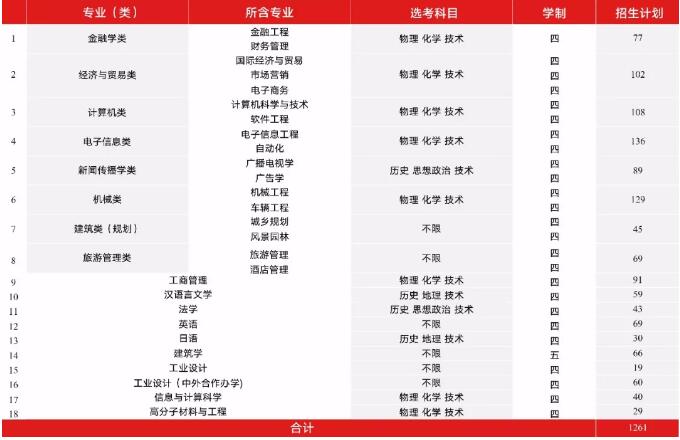2018年,学院设置30个招生专业,其中浙江省有20个专业按大类招生,10个专业继续分专业招生,外省设置的招生大类所包含的专业与浙江省相同(详见计划表);浙江省考生所填报的专业(类)志愿需满足相应选考科目要求。