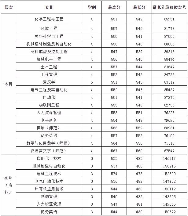 目前,学校设有化学与材料工程学院、机械工程学院、建筑工程学院、电气与信息工程学院、经贸管理学院、教师教育学院、外国语学院等7个二级学院。开设涉及工学、文学、理学、教育学、艺术学、管理学等6大学科门类的32个专业,其中本科专业23个,高职(专科)专业9个。