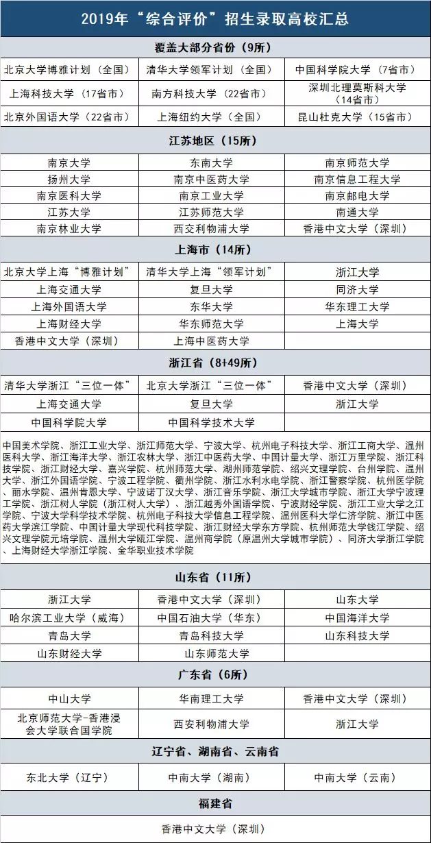 综合评价录取目前仅在部分高校试行,针对部分地区招生。2019年实行综合评价招生的高校如下: