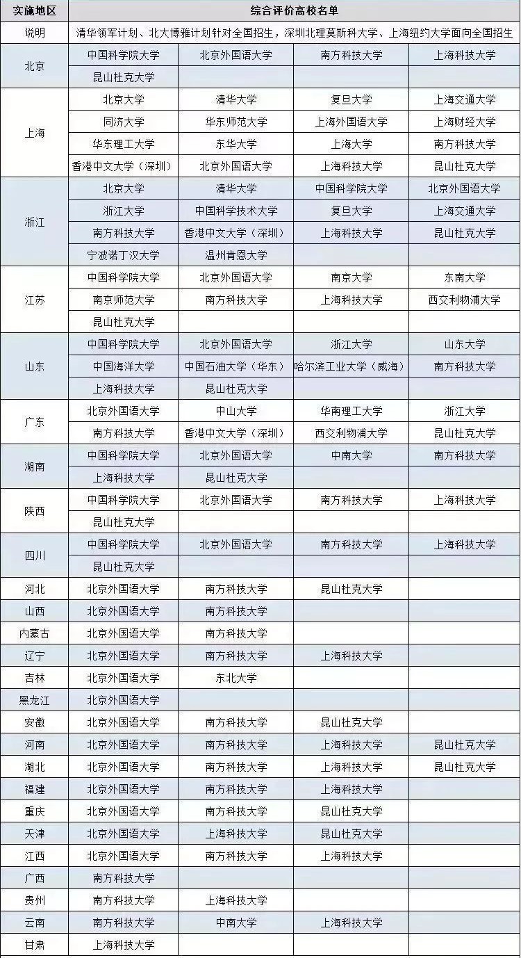 并不是所有的高校都有综合评价资格,高校综合评价招生简章发布是以省份来划分的,下表是部分在各省进行综合评价招生的重点高校名单。粗略来看,在上海市、浙江省和山东省实施综合评价招生的重点大学最多,其中还有提到几所中外合作办学大学也在各省进行综合评价招生,例如昆山杜克大学、上海纽约大学、宁波诺丁汉大学等。