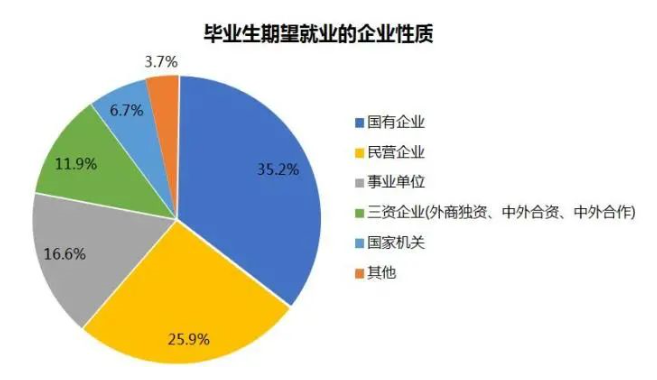 然而,毕业生就业期望与市场现状存在一定差距。工作稳定、福利待遇好的国有企业在毕业生期望就业的企业中占比35.2%,受到更多毕业生的青睐。民营企业紧随其后,占比25.9%。