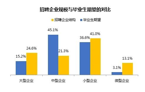 而毕业生期望方面,希望进入中型企业的毕业生占比最高,为45.1%,希望在小型企业就职的毕业生比例紧随其后,为36.6,大型企业和微型企业的比例分别为15.2%和3.1%。
