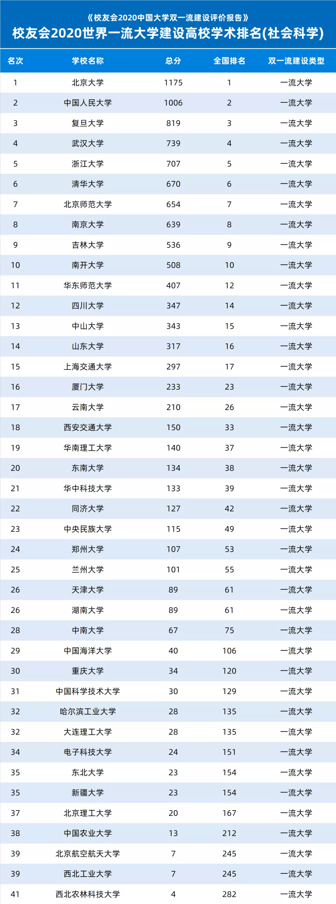 在最新艾瑞深校友会2020中国大学学术排名(社会科学)中,北京大学、中国人民大学、复旦大学、武汉大学、浙江大学、清华大学、北京师范大学、南京大学、吉林大学、南开大学进入前10强。