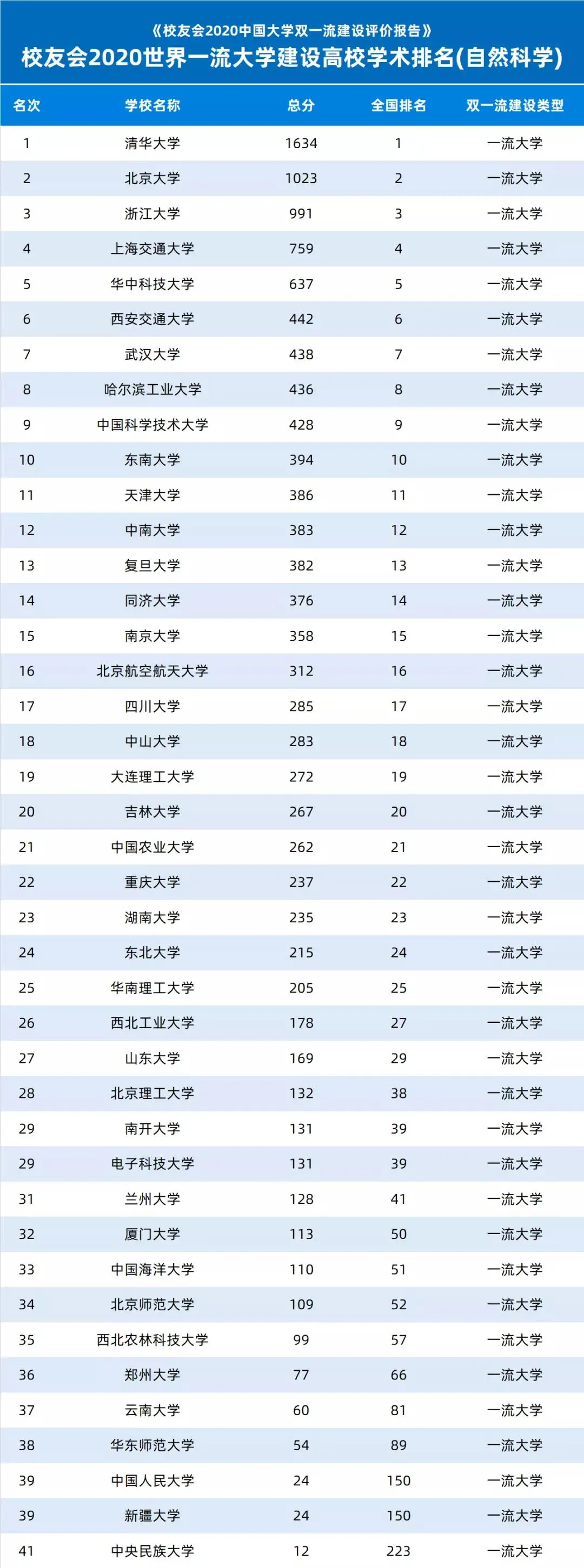 在最新艾瑞深校友会2020中国大学学术排名(自然科学)中,清华大学、北京大学、浙江大学、上海交通大学、华中科技大学、西安交通大学、武汉大学、哈尔滨工业大学、中国科学技术大学、东南大学进入前10。