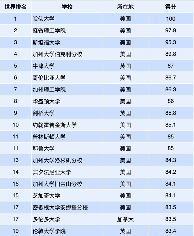 1. 本次排名针对来自86个国家的近1500所顶尖大学进行调研得出;