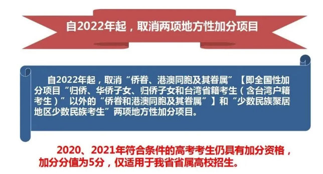 (一)归侨、华侨子女、归侨子女考生和台湾省籍考生(含台湾户籍考生),加分分值从2021年起从10分调整为5分,可面向所有高校投档时使用。