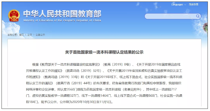 教育部表示,拟认定3560门课程为首批国家级一流本科课程,其中线上一流课程717门,虚拟仿真实验教学一流课程327门,线下一流课程1464门,线上线下混合式一流课程868门,社会实践一流课程184门,公示期为2020年10月30日至11月5日。