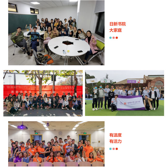 日新书院有贴心的辅导员和完备的学生工作体系,学生活动丰富多彩:定向越野、团队训练营、新生舞会、学生节、趣味运动会、“书院杯”篮球赛、同读一本书等。多种多样的活动形式让同学在集体中成长,在书院中绽放青春。