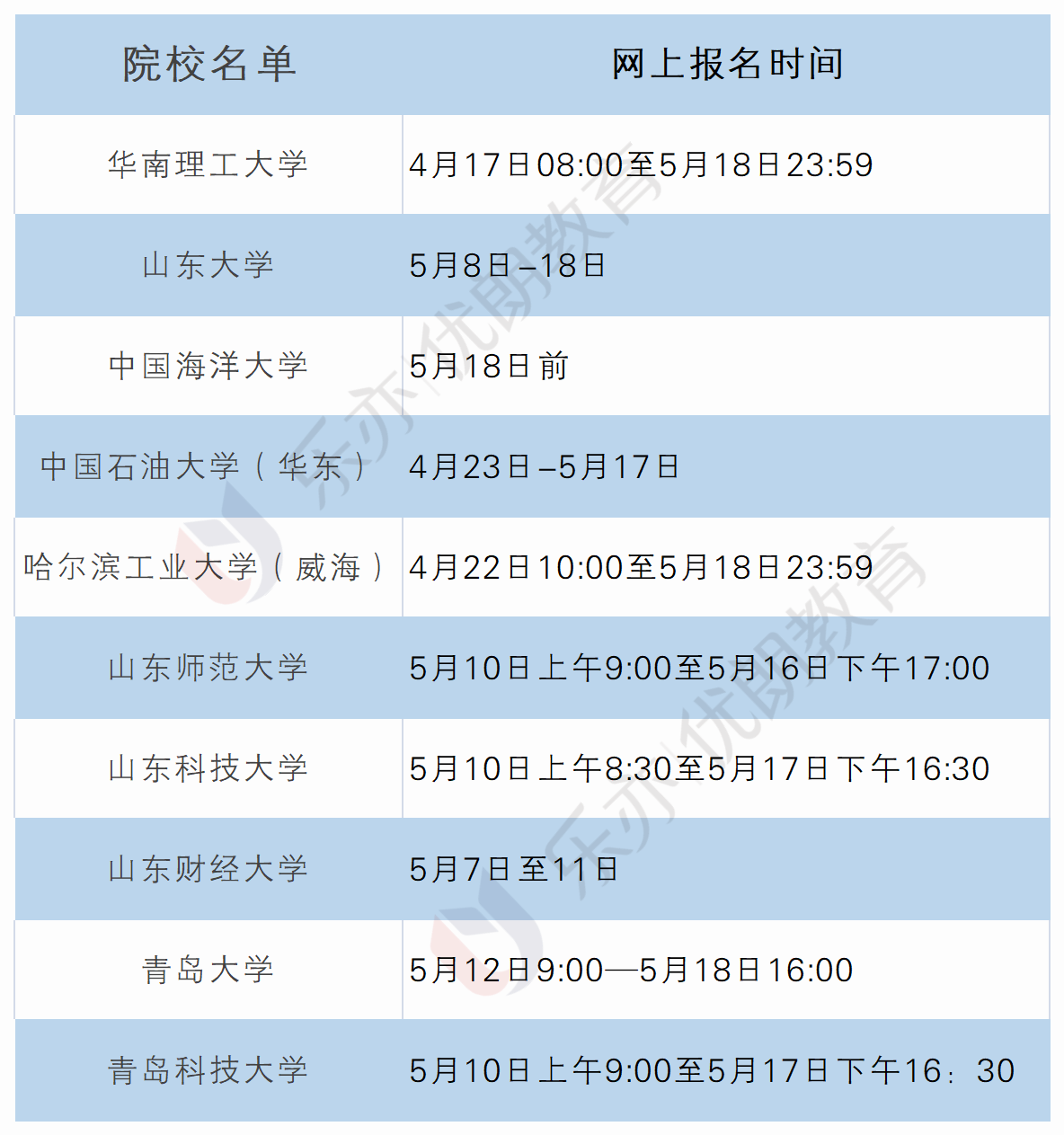虽然10所院校的2021年山东省综合评价招生简章均已发布,但网上报名开始时间并不是马上开启的。最早的院校--华南理工大学已于4月17日8点开放网报,大多数院校要在5月中上旬才开放报名,最晚一所报名截止时间为5月18日24点前。详细信息见下图。