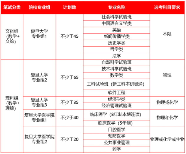总体来看,复旦大学三位一体招生设置理科组的专业类比文科组略多,且理科组有选考科目要求,选考物理的考生无疑拥有更多的专业选择权,另外,选择化学和生物的考生也能有报考复旦三一的资格。