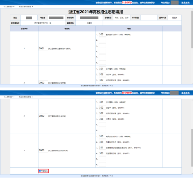 选择浙江警察学院三位一体志愿填报,进入填报界面: