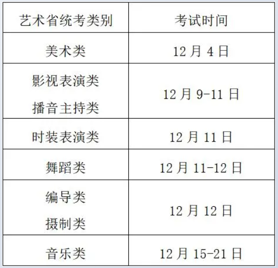 艺术类考生:除文化科目考试外,还须参加专业考试。专业考试包括省统一组织的专业考试(省统考)和高校组织的专业考试(校考)两种形式。艺术类省统考分8类:美术类、音乐类、舞蹈类、时装表演类、影视表演类、播音主持类、编导类、摄制类。考生须选择相应的省统考类别(可多选),并同时填选相关信息,完成省统考报考手续。我省艺术类专业省统考将于今年12月陆续启动,详细安排见下表: