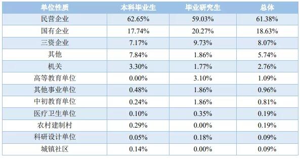 62.65%的本科毕业生选择进入民营企业,17.74%的本科毕业生进入了国有企业,7.17%的本科毕业生进入了三资企业。