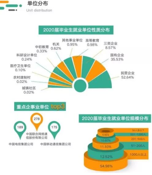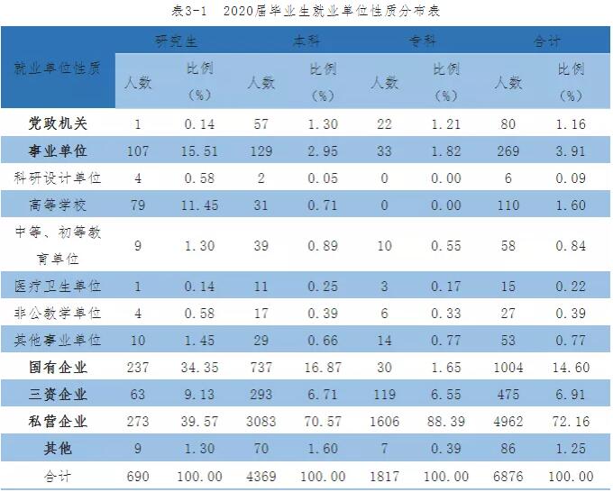 2020届毕业生中,93.67%的毕业生在企业就业,其中,私营企业占72.16%,国有企业占14.60%,三资企业占6.91%。详见表3-1。