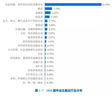 学校 2020 届毕业生行业流向彰显学校学科优势和特色,主要集中在“信息传输、 软件和信息技术服务业”(61.59%),“教育”(7.79%)、“金融业”(6.16%) 和“制造业”(5.10%)次之。