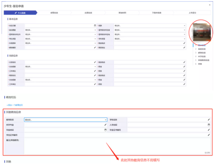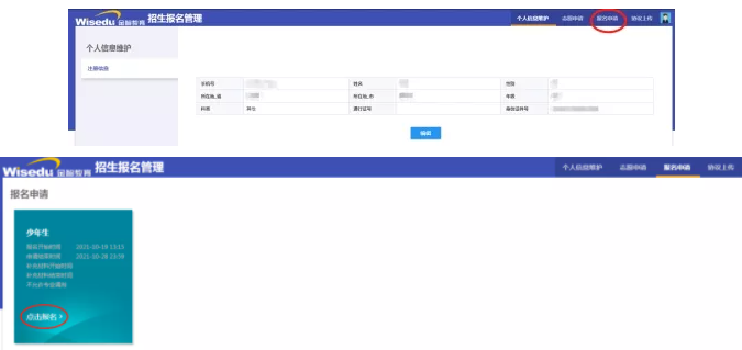 1.进入系统后点击右上角“报名申请”,点击“少年生”报名。