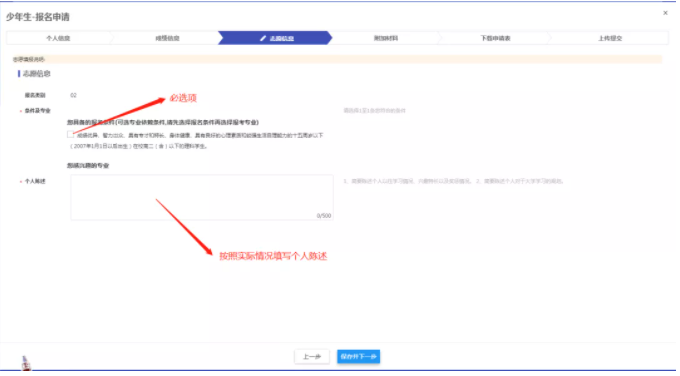 4.根据简章要求和自身教育经历,选择报考条件及报考专业,有且仅可选择一个专业报考(注:本项目不支持选择感兴趣的专业),并按照要求填写个人陈述,报名时间截止后无法更改。确认填报无误后点击“保存并下一步”。