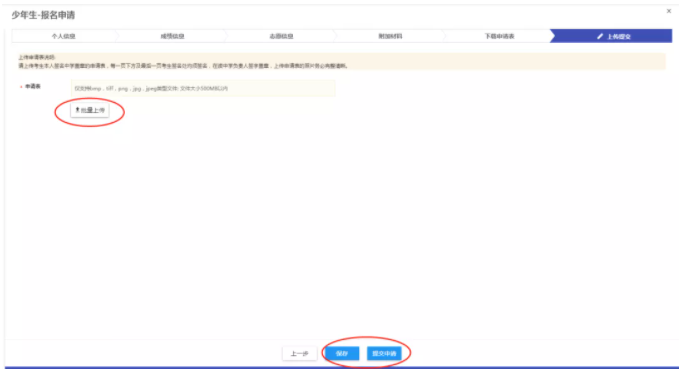 7.学生本人签署,所在中学负责人签字盖学校公章后点击“上传”,上传考生本人签名的申请表,每一页下方及最后一页考生签名处均须签名并有中学签字盖章。点击上传图片(注:不支持PDF、Word),可放大浏览上传照片,确认上传申请表完整且无误后,点击“保存”、“提交申请”即为完成报名。