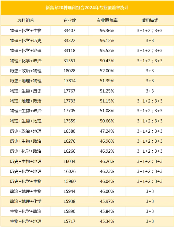 2024年新高考共有20种选科组合,其中物理、化学两科的覆盖率是最高的,统计下来发现,曾经的“理科标准组合”物理+化学+生物覆盖率高达96%。这个组合对考生的逻辑思维能力要求强,能选的专业多,从数据上来看,是考双一流大学的NO.1选择。