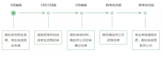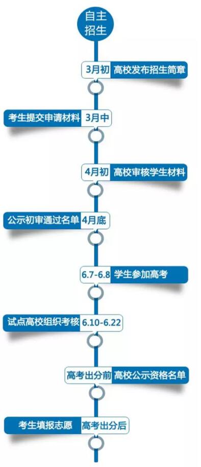各高校一般在3月份集中发布自主招生简章,明确当年自主招生报名、招生计划及考试等相关事宜。招生简章发布后,考生统一在阳光高考平台报名。