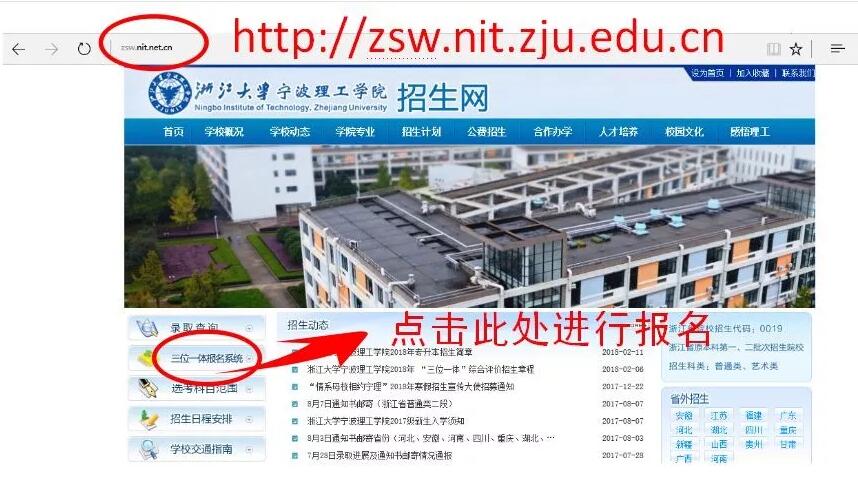 进入浙江大学宁波理工学院官网(http://www.nit.zju.edu.cn),点击进入“本科招生网”(http://zsw.nit.zju.edu.cn),再点击“三位一体报名系统”。