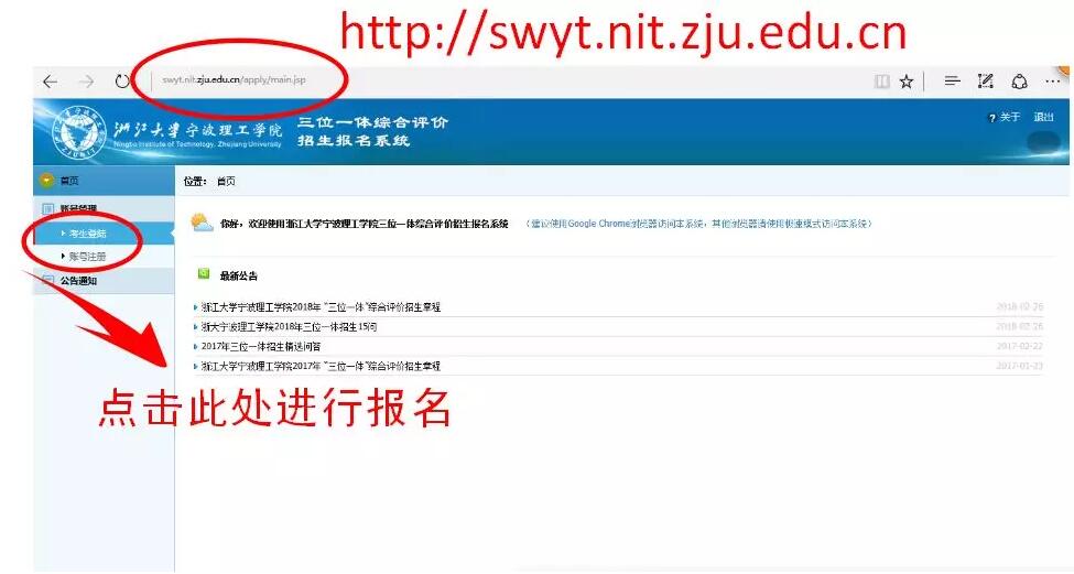 进入浙江大学宁波理工学院招生网(http://zsw.nit.zju.edu.cn),点击“三位一体报名系统”。