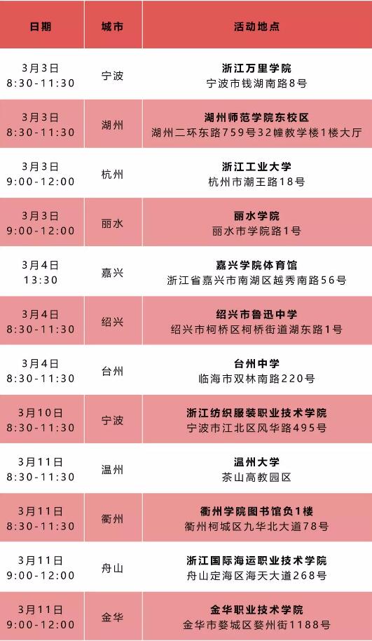 为方便考生和家长进一步了解浙江大学宁波理工学院2018年三位一体招生相关情况,我校于3月3日-4日、3月10日-11日,赴省内11个地市参加现场咨询会,欢迎考生和家长前来咨询。