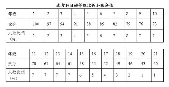 答:考生选考成绩按等级赋分,起点赋分40分,满分100分,共分21个等级,每个等级分差为3分。具体以当次当科考试考生卷面得分(满分100分)为依据,按最接近的累计比例划定等级并按对应关系赋分,其中第21等级比例不超过1%。