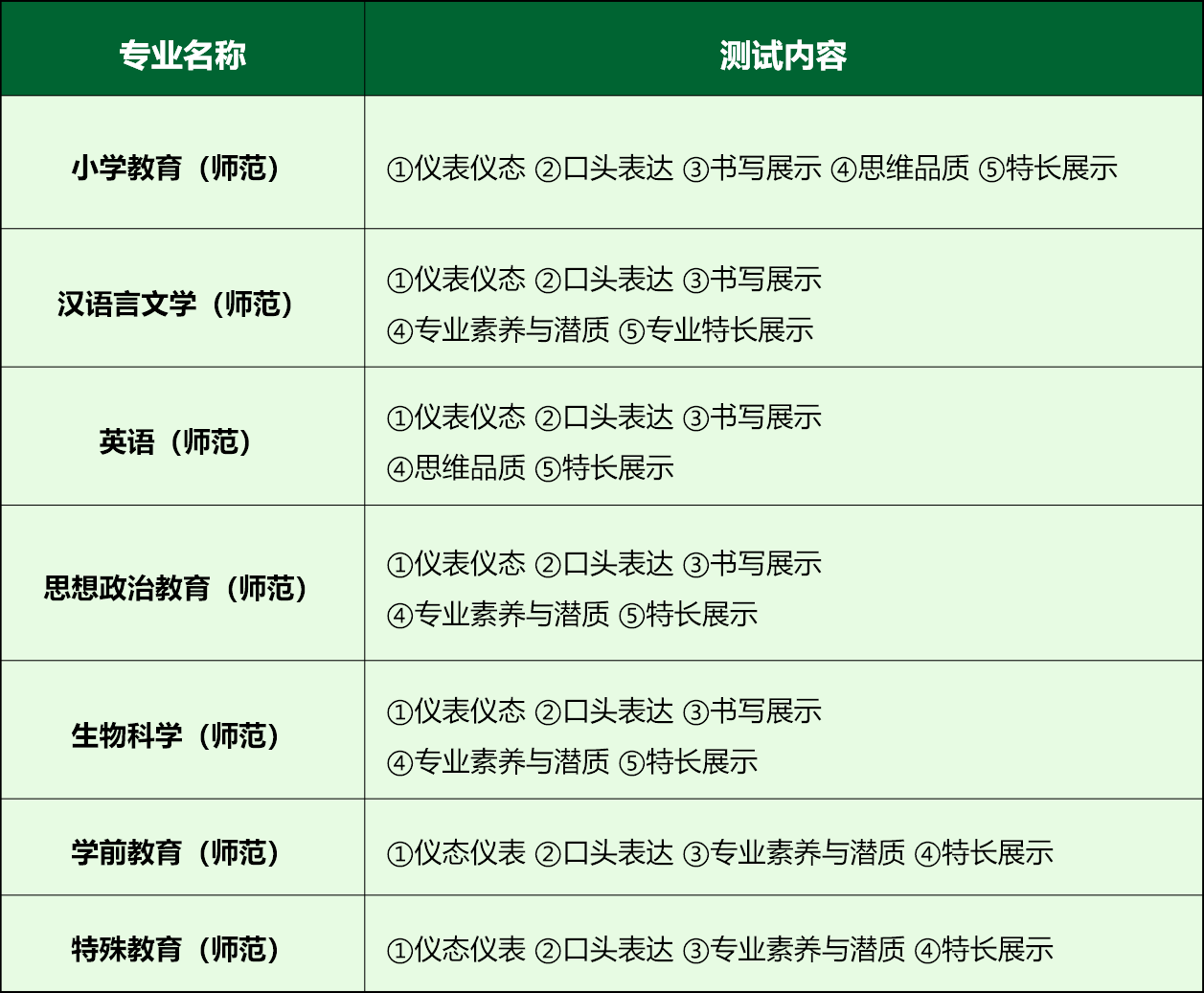 浙师大的三位一体综合素质测试采用分专业面试的方式进行,面试主要测试考生的师范素养和专业素养,师范素养主要考察考生是否适教和乐教;专业素养主要是考察考生的学科性向、专业素养、专业潜质。各专业具体的测试内容如下图所示,每年基本没有变化,比较共性的测试内容主要有仪表仪态、口头表达、书写展示、特长展示、专业素养与潜质。