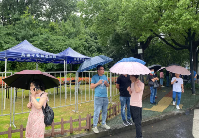 由于疫情防控的要求,家长不能进入学校陪考,即使下着大雨,学校门口仍有不少家长打着伞等候自己的孩子。