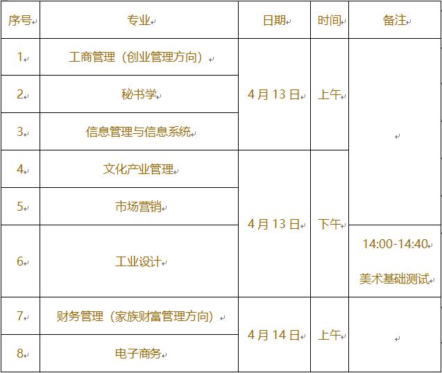 2019年4月13-14日,宁波财经大学三位一体综合评价测试将以面试形式进行,考察学生综合素质和专业素养,其中工业设计专业增加美术基础测试环节。综合素质评价由综合测试和素质特长两部分组成,素质特长以高中阶段在学科竞赛、科技创新、语言文学、体育、艺术等方面取得突出成就的考生提供的奖状、证书为主要依据,如符合多项素质特长的考生可累计,最高为10分。不同专业的测试时间不同,大家可按通知要求参加三位一体面试,具体综合测试时间安排见下表。