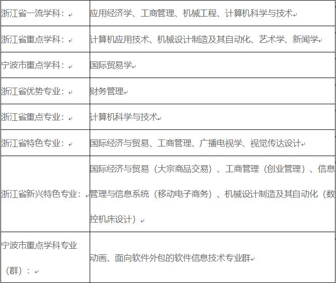 2018年10月,宁波市教育局下发《关于公布宁波市高校重点学科重点专业建设立项名单》,宁波财经学院有四个学科获第五批宁波市高校重点学科建设立项,其中应用经济学为A类重点学科建设项目,计算机科学与技术、工商管理、设计学为B类重点学科建设项目;同时,四个专业获宁波市第四批重点专业建设立项,其中财务管理专业为市级品牌专业建设项目,国际经济与贸易、工商管理、计算机科学与技术专业为市级优势专业建设项目。下表为宁波财经学院各专业目前学科优势情况。