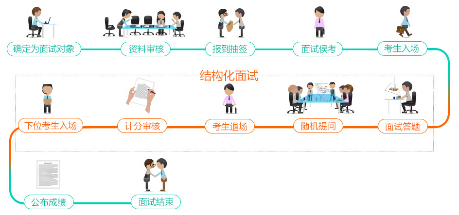 见上图,结构化面试流程从最初的报到抽签候考到考生入场开始,所有表现都会直接影响到当天的面试结果。考生在准备面试前应了解结构化面试特点和流程,并在备考练习过程中总结答题经验,增加面试高分概率。