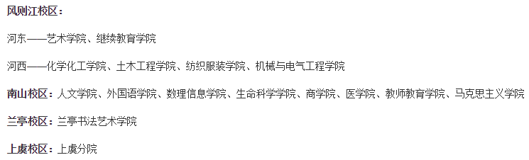 绍兴文理学院位于浙江省绍兴市,是由教育部批准成立的普通全日制综合性高等学校,1996年组建,2019年1月被确定成为浙江省应用型建设试点示范学校,目前共有风则江(河东、河西)、南山、兰亭、上虞等四个校区。绍兴文理学院设有人文学院、马克思主义学院、外国语学院、数理信息学院、生命科学学院、化学化工学院、机械与电气工程学院、土木工程学院等16个二级学院和1个独立学院(绍兴文理学院元培学院),以及绍兴文理学院附属医院,开设本科专业62个,涵盖经济学、法学、教育学、文学、理学、工学、医学、管理学、艺术学等九大学科门类。