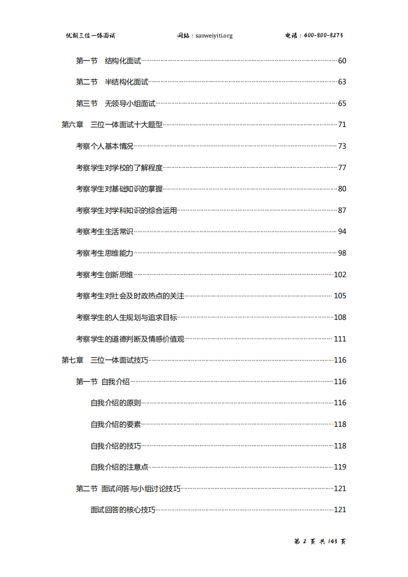 第五章详解结构化面试、半结构化面试、无领导小组讨论三大常考的面试形式,掌握其考核标准和注意事项。未来高校面试的形式必定是多样化的,不可不提高对面试形式的重视程度。