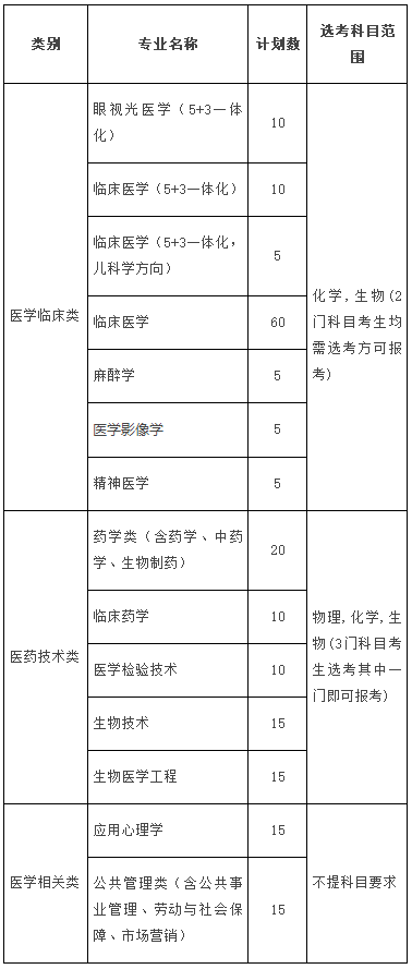 2020年温州医科大学三位一体综合评价招生计划数为200人,按大类招生,共分为医学临床类、医药技术类和医学相关类,不包含文科专业。同时,每个大类三一招生对选考科目有限制,医学临床类要求考生均需选考化学和生物2门方可报考,物理、化学、生物3门科目选考其一即可报考医药技术类,医学相关类没有选考范围要求。参照下图。