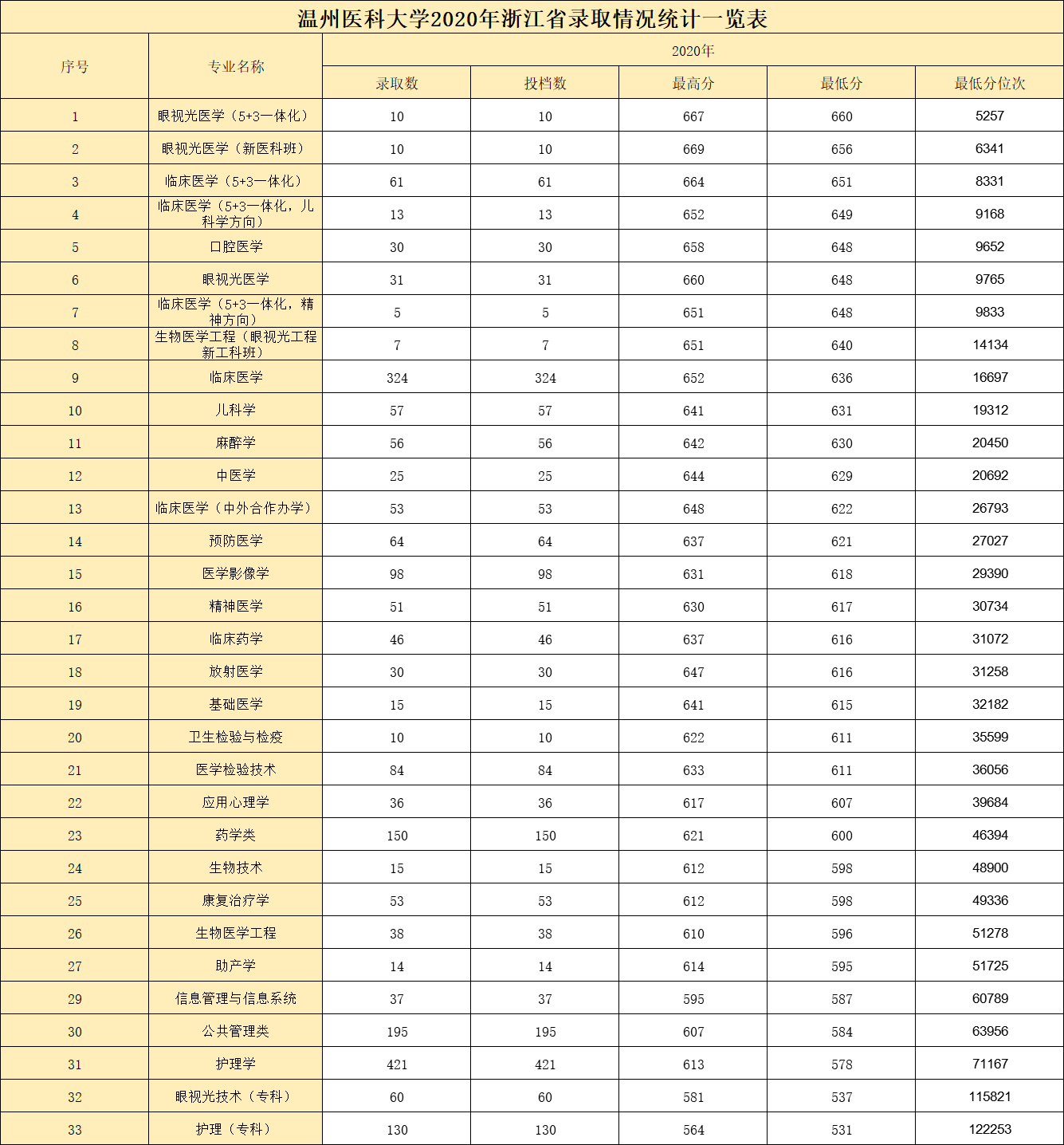 以眼视光医学(5+3一体化)专业为例,2020年该专业浙江省普通高考录取10人,录取最高分667分,最低分660分,最低分位次5257;通过三位一体渠道共录取该专业学生同样为10人,高考最高分是666分,但是录取的最低分为645分。结合以上两者数值,眼视光医学(5+3一体化)专业走三位一体招生的话,录取高考最低分比普通高考录取低了整整15分,可能会相差5000左右个位次。