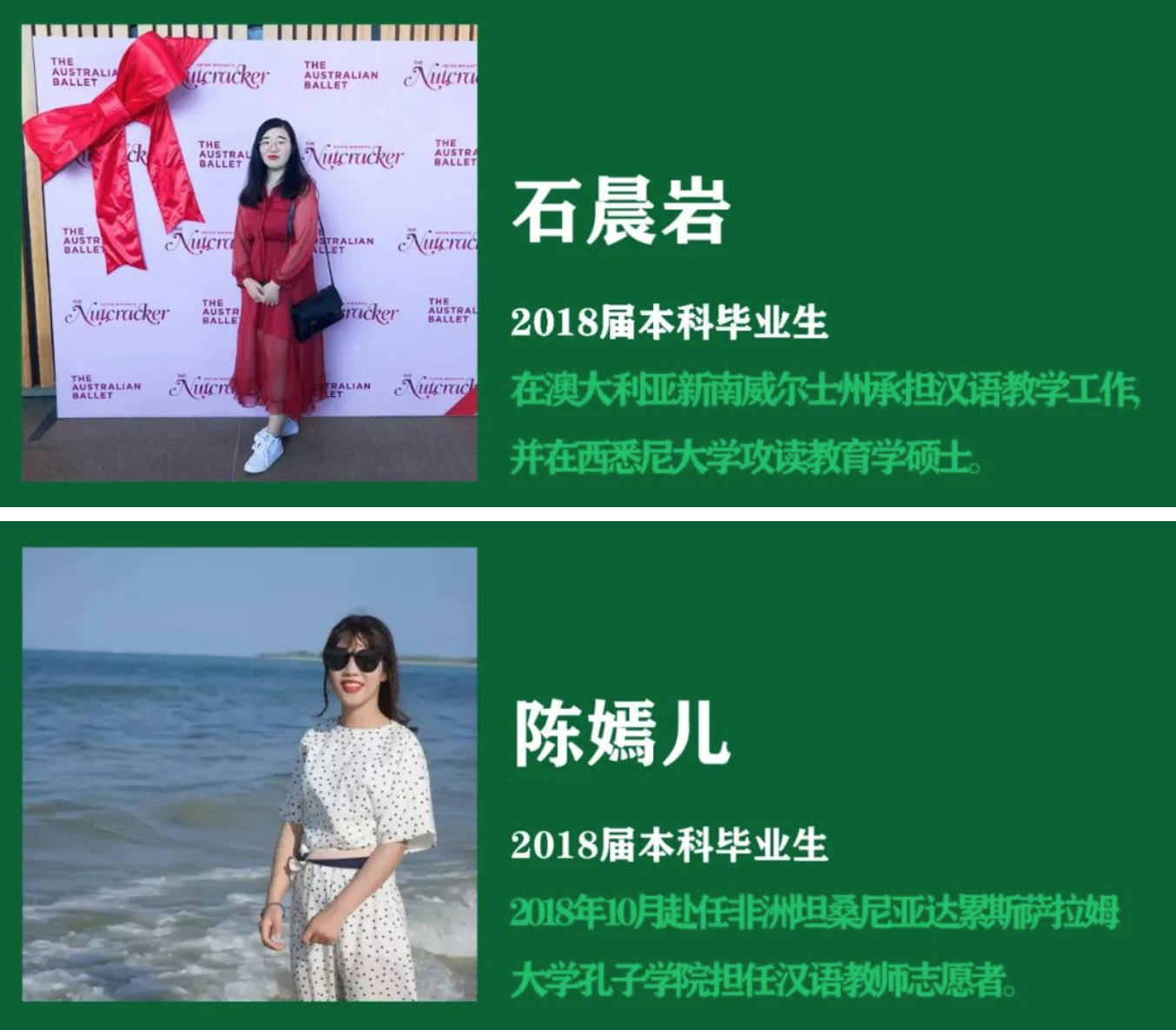 国际学子从这里出发,走向各地,在国内外有关部门、各类学校、新闻出版、文化管理和企事业单位从事对外汉语教学及中外文化交流等相关工作,在涉外企事业单位从事中外文化交流传播工作。走出国门,成为海外汉语推广者,将汉语国际教育当作毕生事业,将中国文化传播视为己任,让世界听到汉语的声音,是国际学子独有的荣耀。