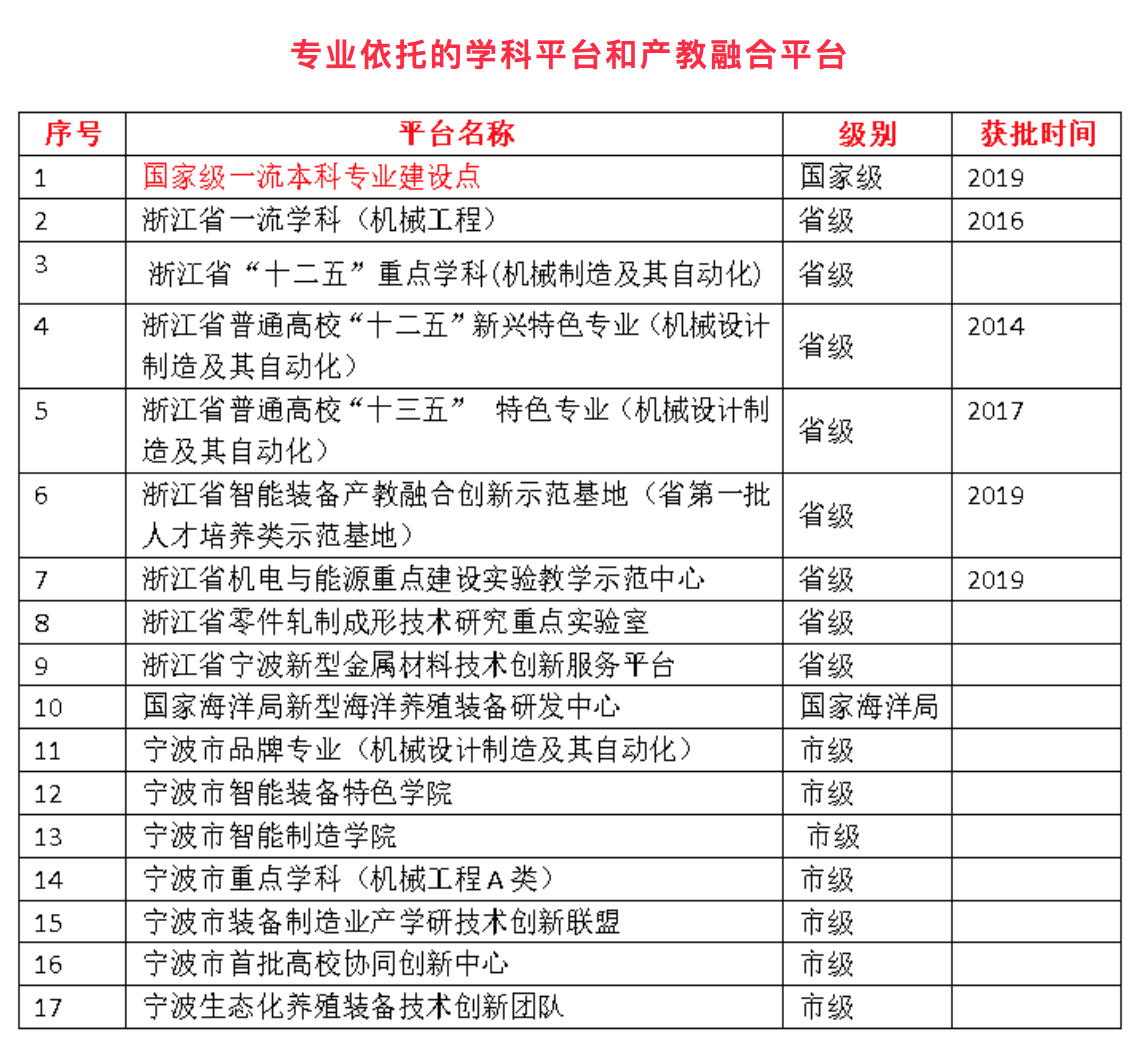机械设计制造及其自动化专业是国家级一流本科建设专业。历经十八年发展,在人才培养、师资队伍、平台建设等方面取得了显著成果。2014年列入浙江省普通高校“十二五”新兴特色专业建设,2016年机械工程列入省一流学科,2017年获省“十三五”特色专业建设项目支持,2018年获第四批宁波市高校品牌专业建设支持,并获批宁波市智能制造学院。2019年智能装备创新示范基地获省第一批人才培养类产教融合示范基地建设支持。